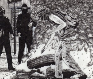 Gdy dotarliśmy na wysokość ulicy Bouboulinas, wtargnięcie dilerów zostało odparte przez grupę zakapturzonych i zamaskowanych młodych ludzi, a na ulicy wzniesiono pierwsze barykady z płonących pojemników na śmieci. Od tego momentu, przez kilka godzin, ruch na ulicy Stournani został odcięty, a liczni zakapturzeni aktywiści, w tym rozmaici imigranci, ciskali kamieniami, butelkami i innym przedmiotami w policyjne oddziały antyrozruchowe MAT, które pojawiły się na ulicy i odpowiadały, strzelając pociskami z gazem.