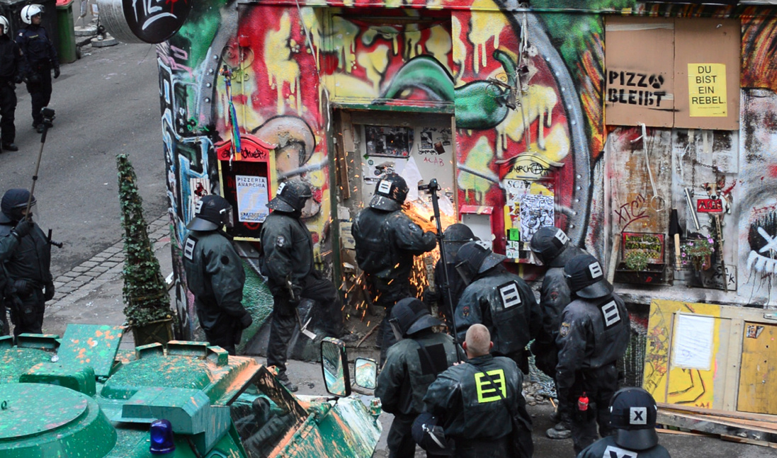 Na miejsce wezwano posiłki. Policjanci byli zmuszeni użyć pił łańcuchowych, by przedrzeć się przez barykady. Lokatorzy, skłotersi oraz zgromadzeni na miejscu aktywiści obrzucili funkcjonariuszy kamieniami i farbą. Jeden policjant został ranny w wyniku uderzenia wyrzuconym przez okno telewizorem. Opór stawiano przez 12 godzin, jednak ostatecznie budynku nie udało się obronić. Dziewięć osób trafiło do aresztu.