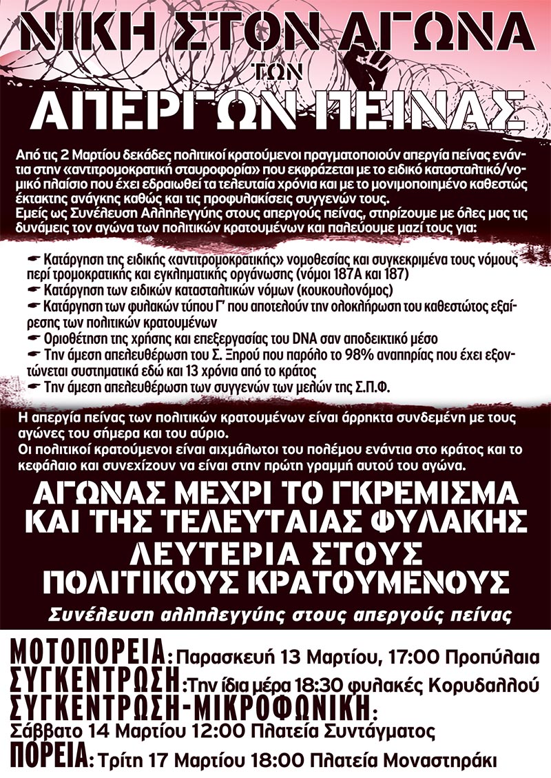 Solidaryzujemy się z greckimi więźniami politycznymi prowadzącymi strajki głodowe, a także domagamy się spełnienia ich żądań: