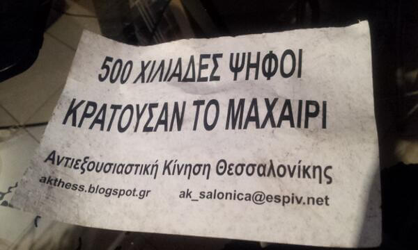 Warto też wspomnieć że wczoraj lider Złotego Świtu przyjął odpowiedzialność za śmierć Pavlosa. Poniżej jedna z ulotek rozrzucanych w Salonikach. Jej treść: 500 tysięcy głosujący dzierżyło ten nóż