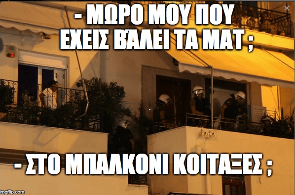 Poniżej zdjęcie gliniarzy wdzierających się do mieszkania przez balkon o czym wcześniej wspomianliśmy. Napisy: – Dziecko moje, gdzie rozlokowano oddziały MAT? / – Na balkonach, widzisz?