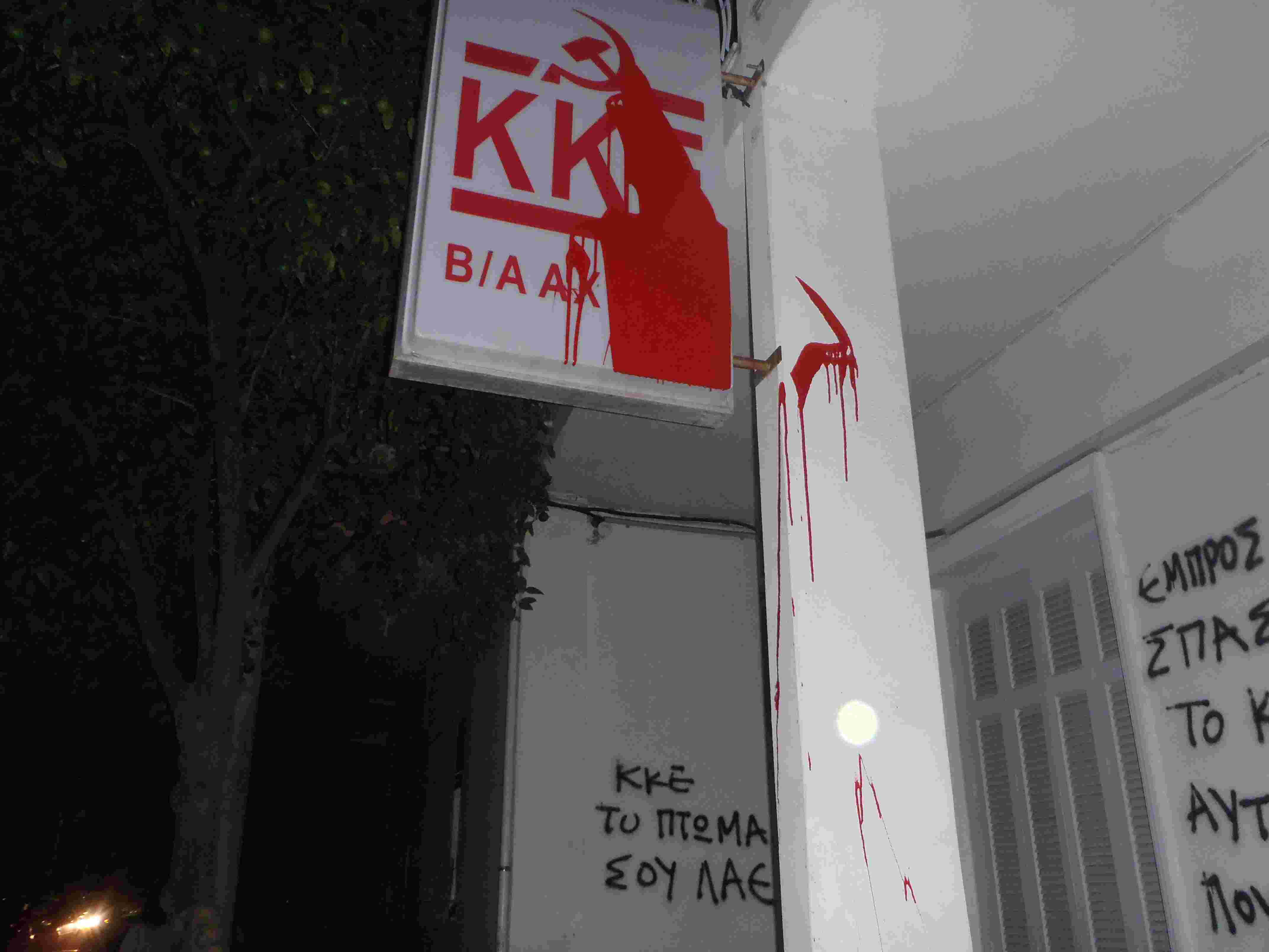 W dzielnicy Halandria zaatakowano biura Komunistycznej Partii Grecji oraz rządzącej partii PASOK, obrzucając je farbą i malując hasła. Poniżej zdjęcia: