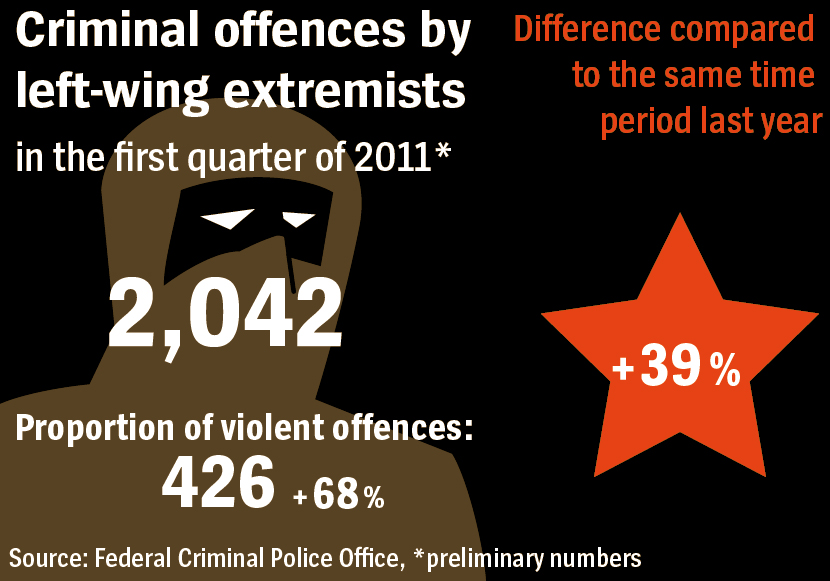 W kwietniu, Federalny Urząd Ochrony Konstytucji, niemiecka agencja bezpieczeństwa wewnętrznego, odnotowała gwałtowny wzrost przestępstw popełnianych przez lewicowych ekstremistów. Z poufnych danych wynika, że w pierwszych trzech miesiącach 2011 r. liczba przestępstw wzrosła o 39% w porównaniu do tego samego okresu w roku poprzednim, osiągając liczbę 2,042. Liczba aktów przemocy wzrosła nawet o 68%, osiągając liczbę 426. Pomimo tego, niemiecki wywiad twierdzi, że jest zbyt wcześnie, by mówić o „wymiarze terrorystycznym”, spodziewając się jednak dalszej radykalizacji. Ich raport stwierdza: „znaczne pogorszenie bezpieczeństwa”.