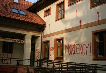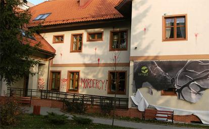 Zamki w drzwiach zostały zaklejone, elewacja nowo odnowionego budynku pokryta czerwoną farbą oraz napisami: „mordercy” , „polowania stop”.