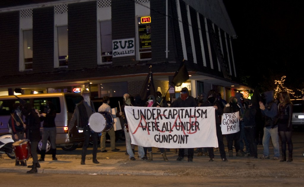 Ponad 25 uzbrojonych funkcjonariuszy oddziału SWAT poturbowało i aresztowało grupę anarchistów, którzy zajęli opustoszały od lat salon samochodowy. Funkcjonariusze użyli broni półautomatycznej ponieważ „grupa osób próbowała zasłonić dużymi bannerami okna i reklamy firmy…”.