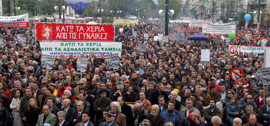48-godzinny strajk generalny zwołany przez dwie główne centrale związkowe GSEE i ADEDY w dniach 19-20 października, wywołał lawinę mobilizacji w całym kraju. Zastrajkowały tysiące pracowników, bezrobotnych, emerytów i rencistów, studentów, uczniów pokazując swój sprzeciw wobec działań podejmowanych w obrębie zgniłego systemu politycznego i festiwalu praw, degradujących społeczeństwo. W Atenach, morze ludzi, towarzyszące największemu strajkowi w ostatnich dziesięcioleciach, uwidoczniło ogromny społeczny i polityczny rozdźwięk pomiędzy większością społeczeństwa, a klasą polityczną i ekonomiczną władzą. Rezultatem jest całkowita delegitymizacja społecznej grabieży. Jedyną bronią w rękach państwa i jego instytucji pozostaje zdławienie oraz hojnie oferowane przez świat parlamentarnej reprezentacji zbawienie.
