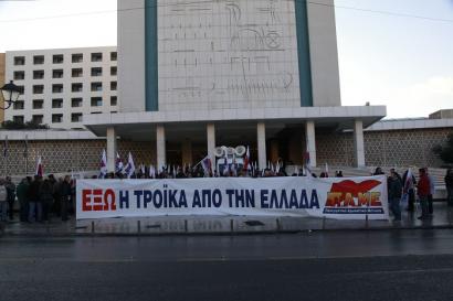 Członkowie Komunistycznej Partii Grecji (KKE) oraz pracownicy zrzeszeni w PAME protestowali w środę rano przed hotelem Hilton w centrum Aten, gdzie zatrzymała się oficjalna delegacja Komisji Europejskiej, Europejskiego Banku Centralnego i Międzynarodowego Funduszu Walutowego.