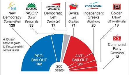 Konserwatywna Nowa Demokracja wygrała niedzielne wybory parlamentarne w Grecji. Partie postulujące kontynuację polityki oszczędnościowej odzyskały większość w greckim parlamencie. Są to Nowa Demokracja Antonisa Samarasa oraz socjaldemokratyczny PASOK Ewangelosa Wenizelosa. Partie te były głównymi siłami klasycznego, greckiego systemu dwupartyjnego, funkcjonującego w tym kraju od momentu przywrócenia tutejszej demokracji.