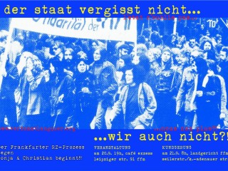We Frankfurcie rozpoczął się proces przeciwko dwójce bojowników radykalnej lewicy. Oboje powiązani są z akcjami zachodnioniemieckich Komórek Rewolucyjnych (Revolutionäre Zellen, RZ) przeciwko firmom nuklearnym, rasistowskiemu reżimowi Apartheidu oraz procesom gentryfikacyjnym w późnych latach 70-ych. Oskarżenia z jednej strony bazują na wymuszonych „zeznaniach” poważnie rannej osoby, która w momencie ich składania znajdowała się pod wpływem leków-narkotyków, z drugiej zaś opierają na kluczowym świadku, który już przed laty został prawnie zaklasyfikowany jako niegodny zaufania. Po 24